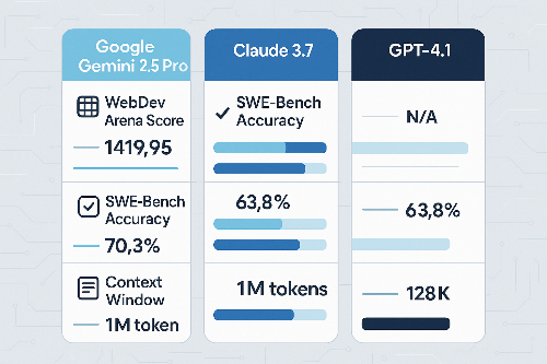 - 제미나이 2.5는 WebDev Arena에서 가장 높은 점수를 기록, 실전 웹 개발 테스트에서 GPT-4.1과 클로드 3.7을 앞섰습니다.